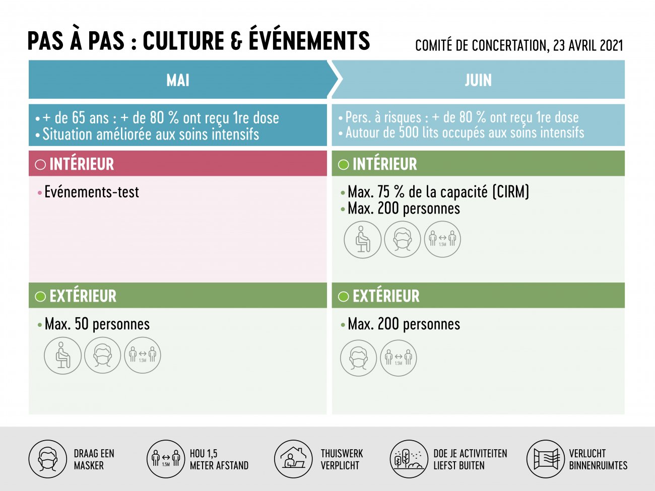 Het Overlegcomité bevestigde ook de eerdere beslissingen voor de cultuur en eventementensector voor de maand mei. Hieronder vallen grote evenementen zoals culturele en andere voorstellingen, wedstrijden en handelsbeurzen.