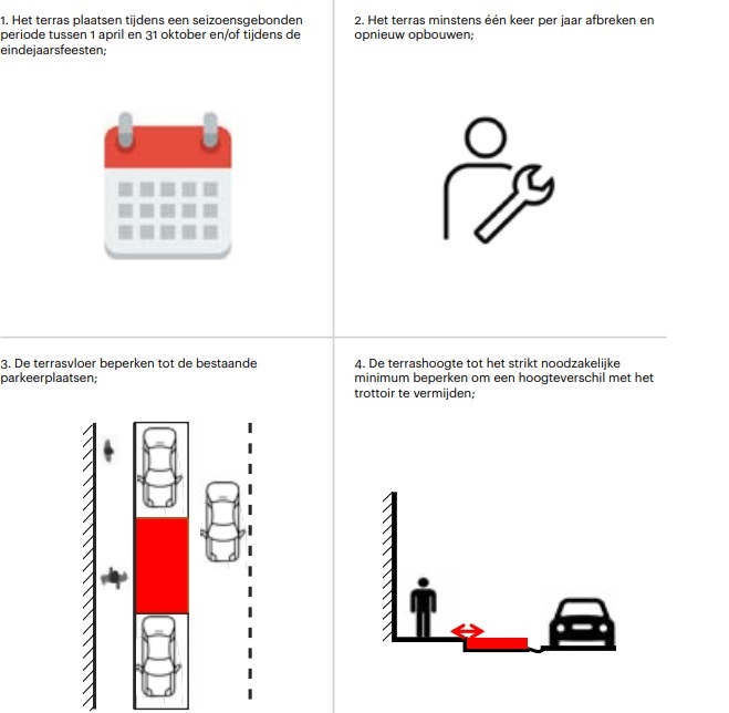 De horecabedrijven wordt geadviseerd buitensporige investeringen in de ontwikkeling van hun terrassen voor de periode 2021 en 2022 te beperken, teneinde een snel rendement op de investeringen te verkrijgen, en de voorkeur te geven aan de beginselen van circulariteit, met inbegrip van de aankoop van tweedehands materieel of de verhuur van materieel, bijvoorbeeld aan spelers in de evenementensector die een voorraad beschikbaar hebben voor verhuur als gevolg van de huidige gezondheidsmaatregelen.
